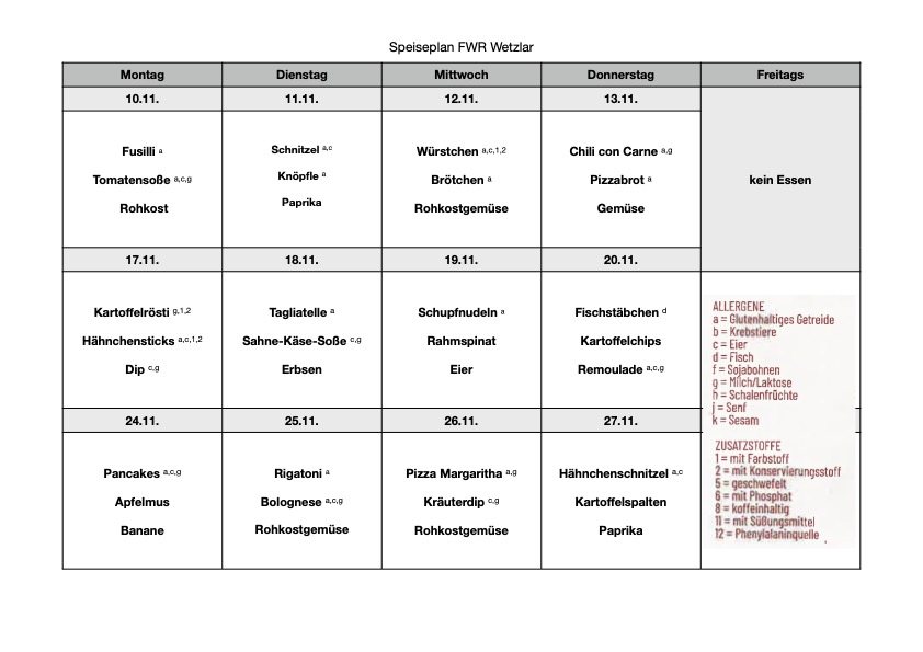 wir freuen uns, Ihnen heute den neuen Speiseplan bis zu den Weihnachtsferien zur Verfügung stellen zu können. Das Mittagessen kostet 6,25 € pro Person und Tag.